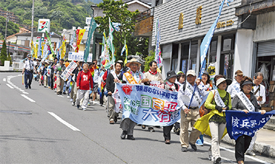 行進は今月7日に川崎市を出発し、県内各地をつなぐように連日開催していた。17日には雨のなか箱根湯本地域一帯を、翌18日に真鶴町民センターからJR真鶴駅までを歩いたほか、最終日の19日は120人ほどが旗や横断幕を手に湯河原の観光会館前から出発。タンバリンなどを鳴らしながら「核兵器いらない」「原子炉事故心配だ」と声をあげ、千歳橋付近で静岡側の団体バトンタッチした。
