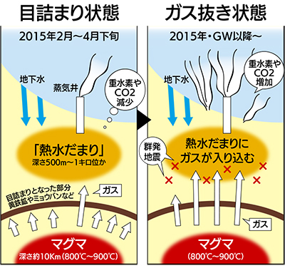 大場教授は「マグマ性ガスが地下に溜まり、その後目詰まりが解消したのでは」と分析する。たとえば温泉配湯管を使い続けると管の内側に湯の花がこびり付くように、地下のマグマ性ガスの通り道も鉱物などの粒子で詰まった可能性がある。それでも奥底からのマグマ性ガスは止まない。大きな殻で覆われるように圧力が高まるものの、ある時目詰まりが解消する。再びガスは地表を目指して岩石と岩石との隙間に行きわたり、地中の構造を動かして群発地震を生む、という見方だ。