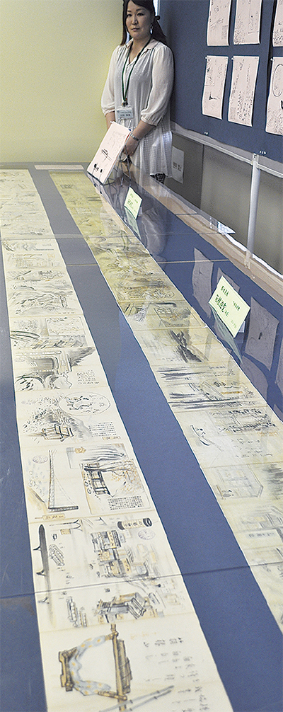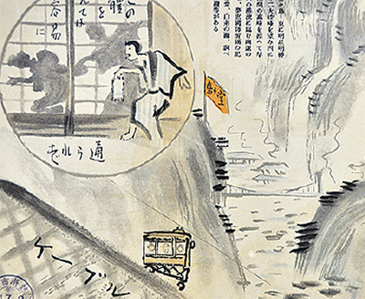 経本のようなページを開くと裏表が絵巻物のように連なっており、ガイドブックのように各名所を紹介。塔ノ澤ページには芸妓と一緒に大騒ぎする観光客が、芦ノ湖では汽船で酒盛りをする観光客がユーモアたっぷりに描かれている。また湯の花沢にあった湯の花製造装置や女性バスガイドの案内など、今は姿を消した風景も見て取れる。8月7日まで。月曜祝日定休。