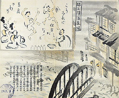 箱根の各温泉地を漫画のように描いた昭和初期の「勝地漫画」(しょうちまんが)が、熱海市立図書館で公開されている。