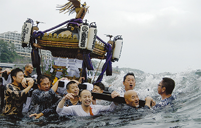 湯河原の吉浜が16日に海開きを迎え、地元の素鵞会の神輿が波に打たれながら海の中を練り歩いた。