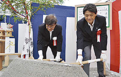 建設予定地(土肥)で10日に行った起工式には冨田幸宏町長や石倉幸久商工会会長、高知尾朝行観光協会長らが参加。樋口浩司会長と冨田町長が鍬を入れ、工事の安全を祈った。
