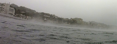 下郡各地で積雪があった24日、湯河原の吉浜もうっすら雪化粧し、この日の午前中は海から湯気が立ち上った=写真。零度に近い外気と海水温の温度差によるもの。相模湾試験場によると「漁業関係者からも湯気が上がるのが例年より早いという声がある」。波を待っていたサーファーによると水中は温かったという。