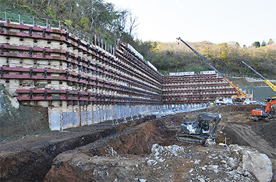 湯河原と真鶴のごみの焼却灰を納める最終処分場の建設現場(吉浜)が、5日に町議らに公開された。コンクリート製の建造物で底と四方を囲うために、山の一部を削り、補強している。