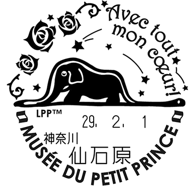 箱根の仙石原郵便局が2月1日(水)から3月31日(金)まで、星の王子さまミュージアムにちなんだデザインの記念押印を行う事になった。「Avec tout mon coeur!(心をこめて)」のフレーズをあしらい、サン・テグジュペリが描いた「帽子」の絵である「ゾウをこなしているウワバミ」をモチーフにしている。