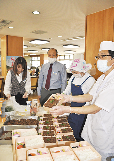 山形県産米「どまん中」の上に、特製のたれで煮込んだ牛肉やそぼろが敷き詰められた米沢駅の名物駅弁で、東京駅構内の駅弁ショップでは年間売上ランキング1位に輝いた。同施設の関係者が山形県出身という縁があり、製造元である(有)新杵屋の船山百栄専務がみずから盛り付けに訪れた。 ネオ・サミットの加藤信次館長は「なかなか外出できない高齢の方もいる。全国各地の美味を味わってもらえたら」。予約も含めた140食が売れ、味わった施設利用者からは「うまかった」の声が相次いだ。