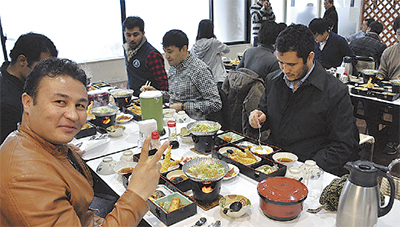 同社でのムスリム向けツアーは2年前に熱海の十国峠で開催しており、これまでに豚肉やアルコールなどを一切使わない特製メニュー「忍者」(2160円)を開発した。1週間前の予約が必要だが、問合せは毎月1〜2度来るという。食堂では通常アルコールなどを扱っているため、予約時にはその旨を必ず説明する。献立は天ぷらやサバの塩焼き、まぐろのカルパッチョや果物など、ほぼ通常の和定食と変わらない。醤油はアルコール不使用の認証ラベルつきで、七味唐辛子やふりかけなどは念のためテーブルから取り除き、万全の態勢でツアーを出迎えた。ランチが始まると続々と「おいしい」の声が。特に学生たちが頷いていたのは手製の献立解説書。イラストと英語で原材料が分かるせいか、安心した様子。「この原材料は?」と唯一指さしたのは、細切れの油揚げだけだった。
