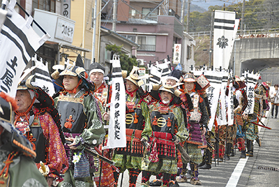 湯河原町で土肥祭の武者パレードが開催され、五所神社から桜木公園に向かって武者たちが鎧を揺らせて連なった。830年ほど前に源氏再興を目指した頼朝と湯河原ゆかりの土肥実平には、それぞれ冨田幸宏町長と土屋誠一議長が扮し馬上から手を振った。神社境内では鎧姿の中高生や公募の参加者らが続々と「やあやあ我こそは〜」と名乗りを上げ、扮した武将の功績などを自己紹介した。公募で武将になった人の中には「一週間かけて髭を伸ばした」「三日三晩眠れなかった」という人も。最後は全員が刀を突き上げて「エイエイオー」と鬨の声を上げた。