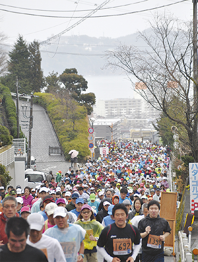 湯河原町で3月26日にオレンジマラソンが開催され、2193人が小雨のレースを完走した。今回はゲストとして明治大の皆浦巧選手(3年)と南俊希選手(1年)が参加し、大河のようなランナー集団を引っ張った。最長部門10Kmの最速は10代・20代男子の樽木将吾さん(小田原市役所・26歳)の31分52秒だった。樽木さんは明大の2人とともにラストスパートに突入、ゴール後息を切らせながら「国府津の山を駆けていたので自信はあった」と話した。このほか、5Km10・20歳代男子の部で田代進さん(箱根明星クラブ)が15分47秒で1位、10Km30・40歳代女子の部で佐藤敦子さん(湯河原病院)が昨年より1分ほど縮め、42分56秒で1位に輝いた。
