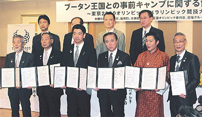 東京五輪・パラリンピックでブータン王国の事前キャンプ地が県内に決まったことを受け、県と関係自治体などが13日、横浜市内で同国五輪委員会会長のジゲル・ウゲン・ワンチュク王子と協定を結んだ。