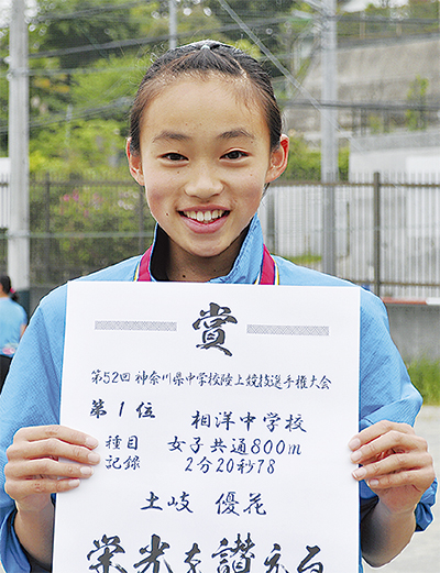 第52回県中学校陸上競技選手権大会が4月29・30日に横浜・三ツ沢公園陸上競技場で開かれ、箱根町の土岐優花さん(相洋中3年)が800mで優勝した。