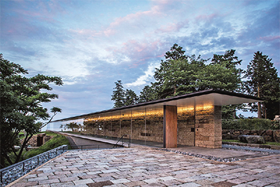 測候所は、3000坪の敷地内に美術品を展示するギャラリー棟、野外の舞台、茶室などを有する。杉本氏が「アートの起源」と称する天空測候の視点を反映させ、冬至・夏至・春分・秋分それぞれの陽光が差し込む軸線に沿って各施設を配置。敷地全体をアートとして設計した壮大なランドスケープだ。
