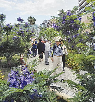 熱海のお宮緑地のジャカランダが今月中旬に見ごろを迎え、青い房のような花々が観光客を引き付けた。ジャカランダは熱海市とポルトガル・カスカイス市との姉妹都市提携がきっかけで植えられ始めた。3年前にお宮緑地に107本のジャガランダを植栽、新たな遊歩道として整備した。市役所ではジャカランダの種を配るなどして名物を増やそうとしている。