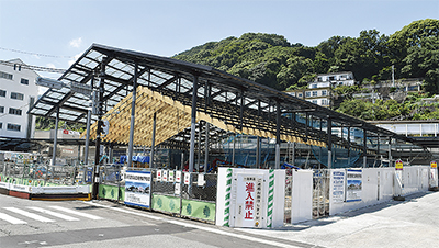 10月の完成を目指して工事が進むJR湯河原駅前広場で、屋根を飾る杉材ルーバーの設置が進んでいる。