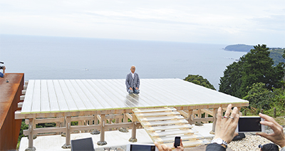 海に面した硝子舞台に立った杉本氏は、幼少期の記憶として残る原風景や土地取得までの経緯などを語りながら「ようやくたどりついた」と完成を喜び「寿命の続く限りこの地でアートを建築していく」と今後の構想を述べた。