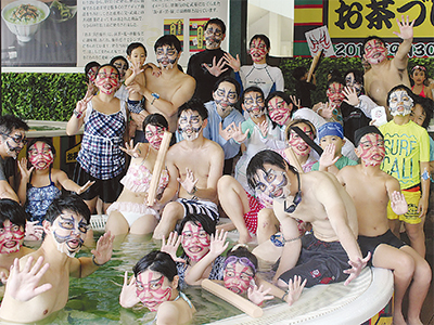 ユネッサンの来場者が歌舞伎の隈取りを顔に貼り、湯船の中から集団で睨みをきかせた。永谷園とコラボした期間限定の「お茶づけ風呂」のイベント(9日)で、顔の隈取りはフェイスパック。お茶づけ海苔のパッケージにも添えられており、黄色や緑などのデザインは歌舞伎で使われる幕の模様がヒントになっている。