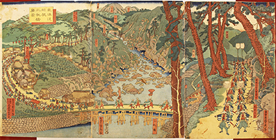 きょう(3日(金))といえば参勤交代の箱根大名行列だが、箱根町湯本の正眼寺では今から150年ほど前、14代将軍・家茂の行列を描いた浮世絵が公開されている。天皇に接見するために京都に向かう行列で、舞台は地蔵が並ぶ湖畔の元箱根や、湯本駅近くの三枚橋(帰路)。延々と続く家臣たちの行列を前に、湯本の住民がつつましく土下座する様子も見て取れる。会場には明治期の古写真など40点を展示。3日午前9時半からカレーやけんちん汁を無料で配る。入場無料。詳しくは【電話】0460・85・5638まで。