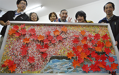 地域作業所たんぽぽ(中央)の利用者が県西地区の障がい者による作品展(9日)に、紅葉が”浮かぶ”貼り絵を出品した。今年は利用者がウォーキングで親しむ幕山の紅葉がテーマ。半年かけた力作で、新崎川を表現するため瀬戸内海産の砂を貼り、迫力を出すため糸を張って葉を浮き上がらせた。昨年は地元の遠景を貼り絵にし、金賞を獲っている。