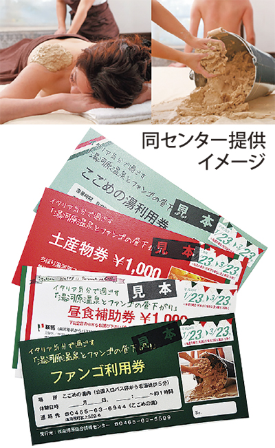 ファンゴは湯河原の日帰り温泉・こごめの湯に施術スペースが整備されており、同センターのスタッフがファンゴ活用を念頭に、昨秋にプランを企画したという。 食事の際は1000円分の補助券が町内のイタリアンレストラン「トルティーノ」または「鞍馬」で使えるほか、ちぼりでは1000円分の土産物券が使える。参加費は6千円で、定員は100人。利用当日にファンゴ・こごめの湯利用権、昼食補助券、土産物券の4枚を受け取り各自で移動する仕組み。期間は3月23日まで。要事前予約【電話】0465・63・5599。
