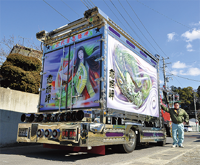 「三代目・恋姫岬」のオーナーである江川繁仲さん(44・自営業)がトラックに目覚めたのは湯河原小学校に通っていた頃。テレビで放映されていた映画「トラック野郎」シリーズを見てデコトラに感化され、自転車を飾り始めた。いわゆる「デコチャリ」である。その後18歳で初めて3トン半のトラックを購入し、伊豆市の恋人岬にちなんで「恋姫岬」と命名。現在はかれこれ3代目になる。車体にはキーワードを入れた「アンドン」が掲げられ、足元をがっしり固めているのは「キャデラックバンパー」。電飾は最近増えたLEDを使わずに「温もりがある」普通の電球にこだわる。運転席のドアを開けると、昭和ムードのシートとシャンデリア。この内装は「金華山のマドンナのホワイト」。この世界を知る人には通じる説明だ。ここまで車の装飾にこだわりながら、江川さんの職場は製造業でドライバーではない。恋姫岬号はトラックのイベント等に出場する以外は、ほとんど車庫に収まっているという。メッキのワックスがけといった手入れも大変で、仮に公道に出ても木の枝が装飾にぶつかりやすい山方面は決して走らない。それでも埼玉や群馬などでのイベントがあれば足を伸ばす。恋姫岬号はこれまで雑誌で紹介された事もあり、撮影を心待ちにしているファンも多い。デコトラの道に目標はなく「今が到達点かな」。目を閉じれば映画「トラック野郎」の登場人物たちが浮かぶ。おっちょこちょいだが人情に厚い彼らの魂を、江川さんは装飾パーツの形で受け継いでいるのかもしれない。主演の菅原文太を語る時は、必ず「さん」を添えている。