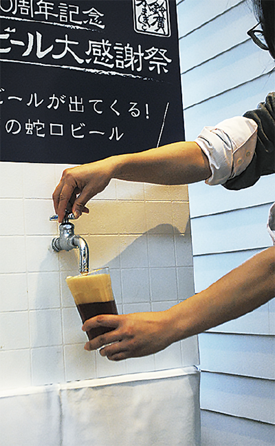 (株)鈴廣のバイキングレストラン「えれんなごっそ」(風祭)で、蛇口からビールがでる特別イベントを開催している。同社が開発した地ビールの誕生20周年を記念し、蛇口からビールを注ぐ楽しさを味わってもらおうと発案。和食にあう味をコンセプトに、かまぼこの製造工程で使う天然水で仕込まれたビールで、繊細な飲み口が特徴だという。