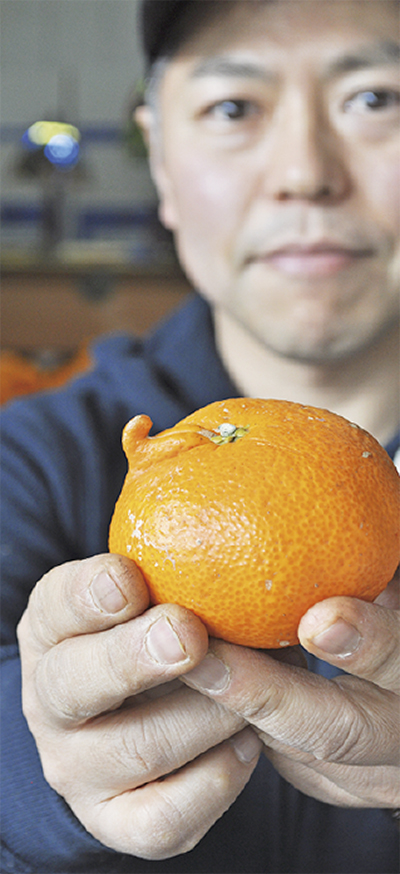 湯河原町土肥のみかん販売店・石澤商店の店頭にフック状の突起がついたみかんが置かれている。12月に収穫されたもので、石澤秀樹さん(44)が入荷した青島みかんのカゴに偶然入っていた。これまでもナイキのロゴそっくりの模様がついたみかんや、ハート型みかんなどを発見したという石澤さん。このみかんは「フッくん」の愛称で呼び、今は「試食どうぞ」の札をぶらさげている。食べる予定はないという。