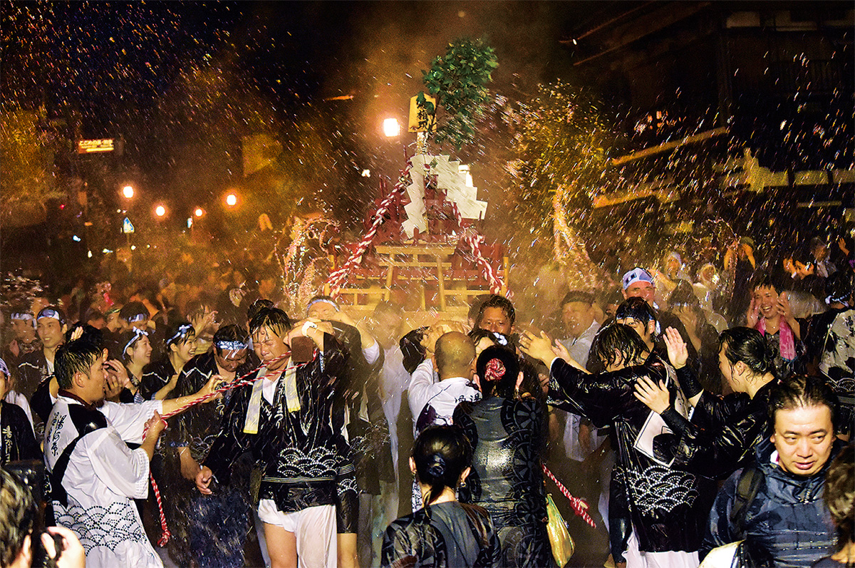 湯河原の温泉街が26日夜に「湯かけまつり」で賑わい、温泉街に湯気が立ち込めた。不動滝を出発したみこしを待ち受けていたのは県道沿いや泉公園に並んだ計千個の温泉樽だった。観光会館前では参加者同士で掛け合う人や、桶を抱え助走をつけて湯を放る人も。そして一眼レフを持った記者の背にも容赦なくザブリ。みこしの後には放水車も続き、これでもかと雨のような湯を降らせた。四方八方から浴び続けた担ぎ手たちの目は真っ赤。「よーいよいと〜」の掛け声とともに、みこしの動きに身を任せていた。