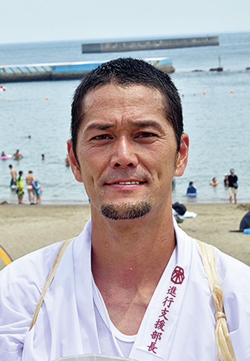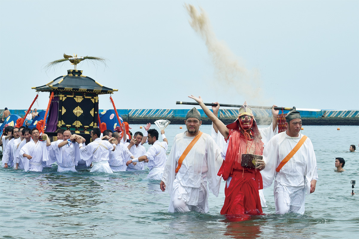 熱海のサンビーチで16日、こがし祭りの浜降り神事が行われた。導きの神である天狗を先頭に獅子や御鳳輦が海水浴場に到着。海水浴客の見つめるなか海に突き進んだ。「麦こがし」を振り撒き、大厄の42歳となった男たちが「みょうねん」と声を出しながら続いた。祭りは麦こがしを神前に供えた故事にちなむ。