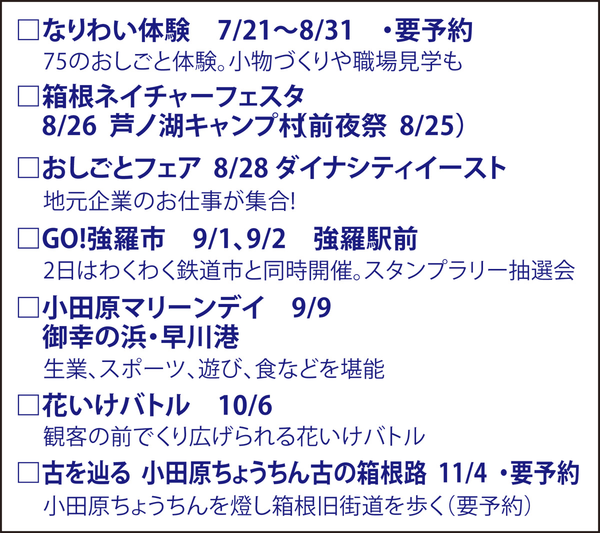 地域をお仕事のテーマパークと見立てた「なりわい体験」は7月21日〜8月31日(金)、参加企業や商店でモノづくり体験や職場見学ができる(要申込【電話】0465・20・9441平日午前9時〜午後5時)。芦ノ湖で自然を満喫する「ネイチャーフェスタ」(8月26日(日))、御幸の浜と早川港でなりわいや遊び、食を満喫する「おだわらマリーンDAY」(9月9日(日))、小田原城で華道家が制限時間内に同じ材料で花を生ける「花いけバトル」(10月6日(土))ちょうちんを灯して箱根旧街道を歩く「古を辿る」(要予約・11月4日(日))ほかが予定されている。