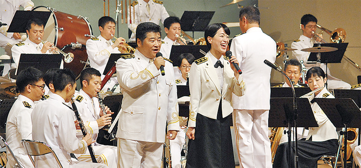 満員に埋まった大ホールでは勇壮な行進曲などを披露。海上自衛隊の歌姫と呼ばれる三宅由佳莉三等海曹が東日本大震災復興支援ソング『花は咲く』を観客と声を合わせて歌った。