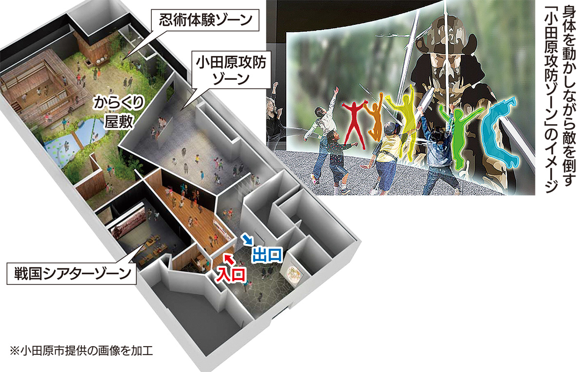 来館者は3つのゾーンを歩いて巡る。最初の「戦国シアターゾーン」では、映像で北条五代の歴史を学んだ後に小田原城を救う「忍務」が言い渡される。続く「忍術体験ゾーン」にはからくり屋敷や池があり、隠し扉などの仕掛けもある。最後の「小田原攻防ゾーン」では、動きを感知するセンサーを利用し、スクリーンに映し出される敵を協力して倒す。リニューアルオープンは2019年4月中を予定している。