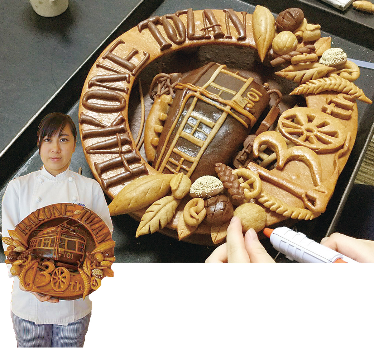 小田原鉄道歴史研究会の資料展(終了)に登山電車モハ1型の飾りパンが登場した。国府津の神戸屋ふるや店で働く古谷恵瑠花さん(27)が家族の勧めで作ったもので強力粉やライ麦粉を使い、黒い部分はココアで色づけしてある。膨らまないように生地はイーストを入れずに練った。窓枠やパンタグラフまで細かく形作ったが「鉄道ファンの方が見たら納得されないでしょうね」。古谷さんはこれまでに結婚式のウェルカムボードや国府津駅の130周年記念の飾りパンを作った事もあるという。