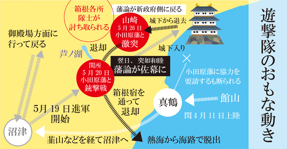 小田原藩は新政府軍に従っており、遊撃隊が領内を通らないように説得したものの失敗。箱根関所で遊撃隊との銃撃戦が勃発した。ところが翌朝、突如小田原藩は和睦を提案し、遊撃隊は小田原城下入りを果たす。小田原城内が佐幕(幕府存続)に転じたのだった。