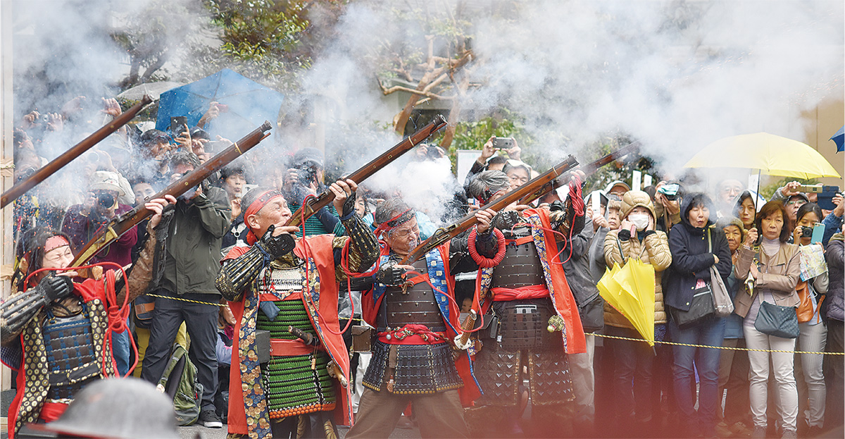 小田原藩11万3千石の格式を再現した箱根大名行列が3日に湯本を練り歩き、随所で披露され火縄銃の演武に人垣ができた。北條鉄砲衆が構えるのは、登録証付きの江戸期の火縄銃。「ズドン」という空砲とともに火の粉が舞い、白い煙が一帯にたちこめた。行列には各国の駐日大使や地元の芸者衆なども加わり、ゲスト出演の花田虎上さん(元横綱若乃花)が笑顔で握手に応じていた。