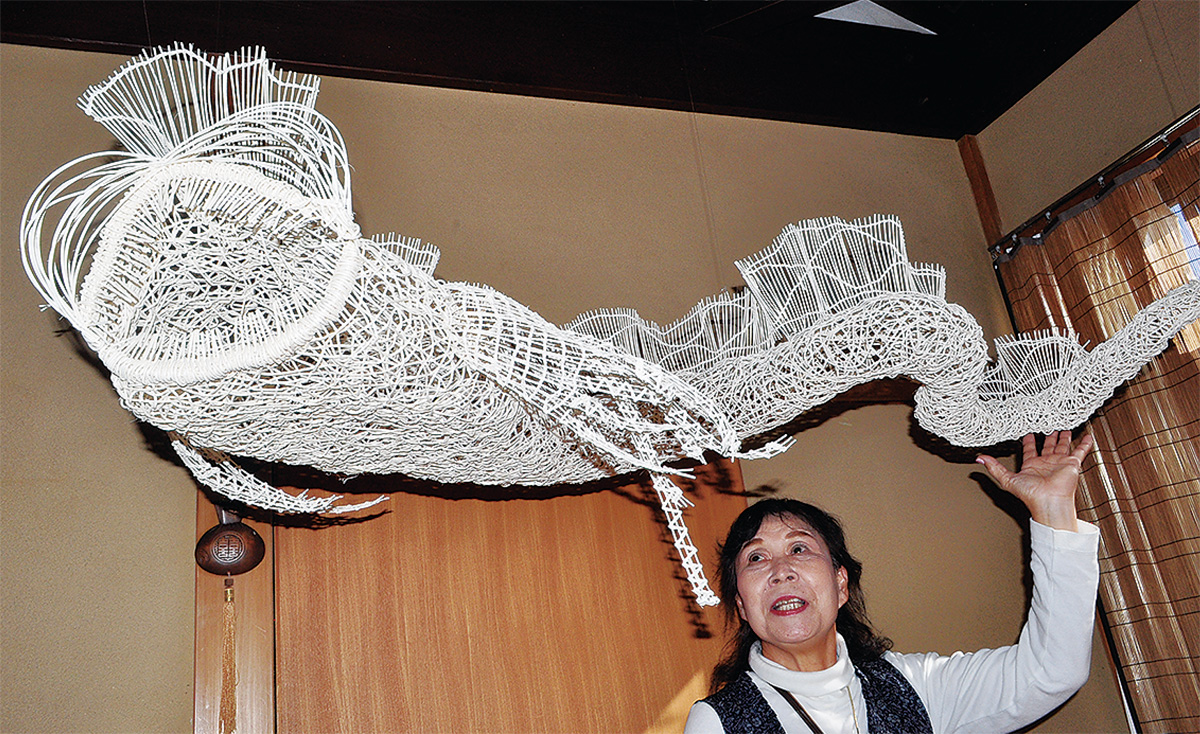 湯河原と真鶴、熱海市泉で、住宅や店舗を美術館に見立てた「アート散歩」が30日に閉幕する。最終日も20会場で作品が楽しめる。先週までの会場には、町を探検するようにアート巡りをする人達で賑わった。吉浜の住宅街にある「工房YOSHIDAYA」では籐を編んで「太古の海」を表現。抜け殻のような深海魚オブジェ「シアワセノツカイ」=写真上=は、リュウグウノツカイの先祖で「見た人が幸せになる」というコンセプト。