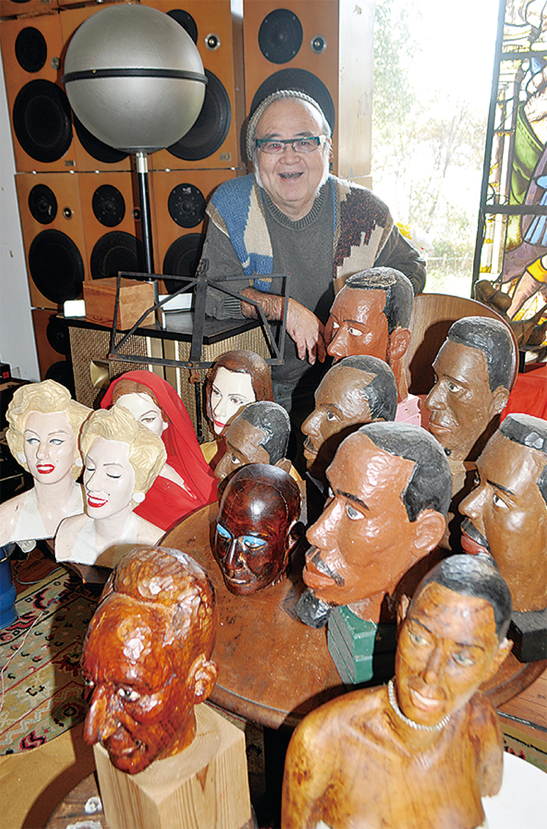 真鶴半島の森に包まれた「おバカのおうち」ではマリリンモンローやミュージシャンたちの顔の木彫りがずらり。町内で譲り受けた楠材で好みの顔を彫ったという。室内には大型スピーカーが壁のように並び、リクエスト曲が流されていた。