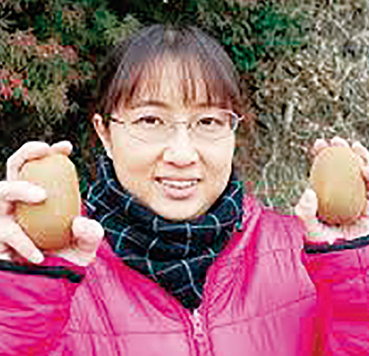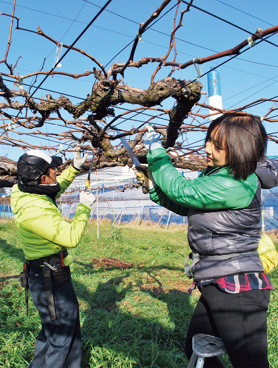 湯河原に生まれ、湯河原中の出身。23歳で結婚するまで農業に触れる機会は特になかった。「農家に嫁ぐことに不安はあったけど、皆温かい人ばかりだった」。今でも忘れられないのは、初めて横浜のブランド柿「浜柿」を食べた時のこと。「甘さと食感に衝撃を受けた。多くの人にこの味を知ってほしい」と決心した。以前はほとんど食べられなかった野菜も、新鮮な採れたてを食べるうちに「不思議と何でも食べられようになった。毎日幸せ」と笑顔で語る。約5200坪の広大な敷地では果物のほか野菜も栽培。1年365日ほぼ休まず働く妥子さんだが、ブドウの摘粒(てきりゅう)作業は特に大変だという。放っておくと1房に100粒以上の実が付くブドウを26粒ほどに統一するため、完成形を想像しながら間引いていく。その数約7000房。家族総出で行っても約2週間かかる作業だ。「一つひとつ丁寧に。この時季、夫は朝3時半から夜12時過ぎまで畑に出ていてすごいなって。一家の主として頼りがいがある」。新井園主も「他人では務まらないかけがえのない存在」と互いにたたえ合う。妻であり2人の子の母でもある。湯河原に帰省すると子どもは実家の窓から見える東海道線や新幹線に見入る。故郷に向け「同じ県民同士、農業を盛り上げていきましょう」とコメントした。