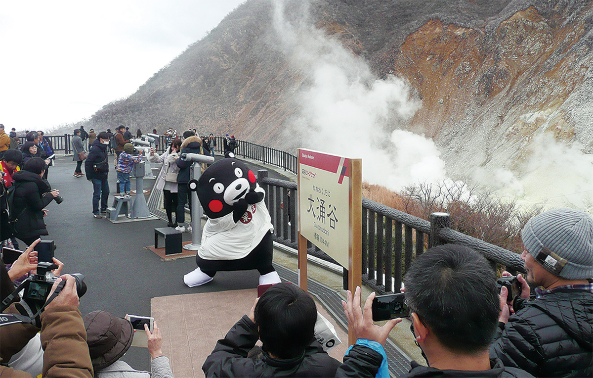 大涌谷駅に12月24日、熊本県の営業部長兼しあわせ部長のくまモンが現れた。同ロープウェイと阿蘇山ロープウェー(現在代行バスを運行)は箱根と阿蘇の噴火の影響で運行休止を余儀なくされた際に、お互いのグッズを販売し合うなど、応援と交流を続けてきた。