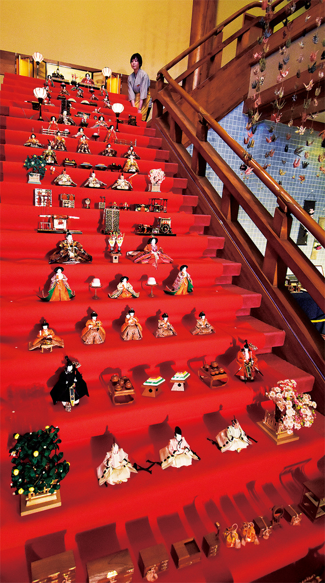 ひな祭りを1ヵ月後に控え、芦ノ湖畔の日帰り温泉・龍宮殿に20段飾りがお目見えした。同館は国登録有形文化財で、天井の高い階段ホールは同館の見どころの一つ。「来場者に季節感を味わってほしい」と企画した。総勢45体と牛車や輿などは圏央地区の神社から譲り受けたもので、7段飾りを3つ分展示している。展示は3月10日まで。