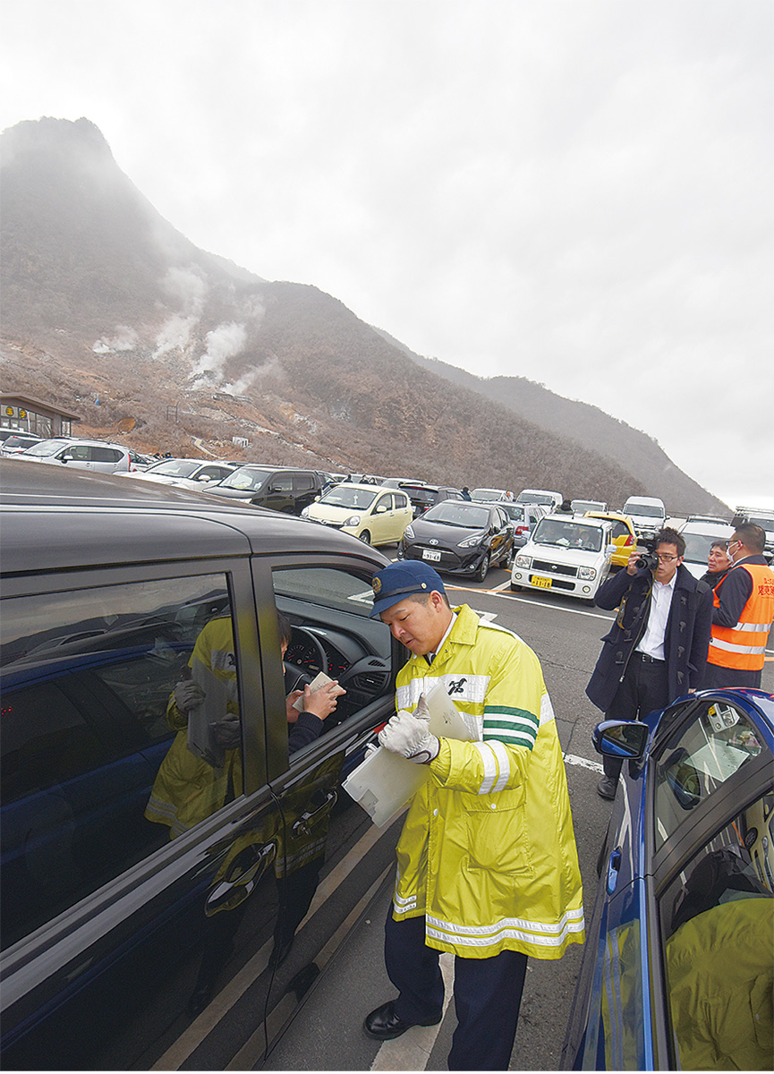 白タクで多いとされるのが「わ」ナンバーのレンタカーやワンボックスカー。こうした車両が大涌谷に到着するたびに小田原署員が旅の目的や、乗っている人が誰なのかを尋ねる。返事の多くは「家族」「親類」だ。