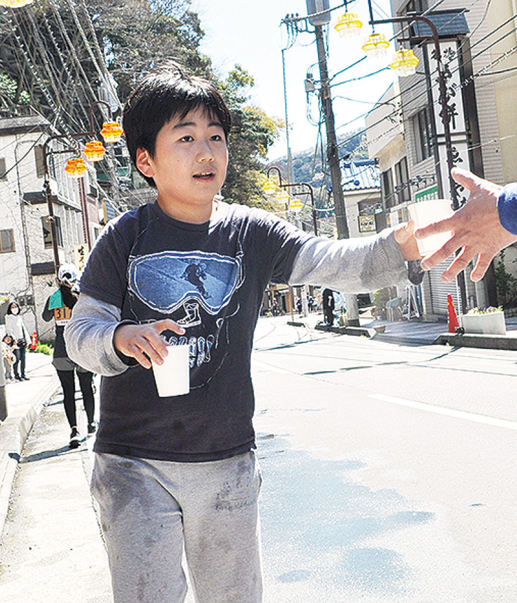今回も大勢のボランティアが縁の下で大会を支えた。温泉場の給水所では佐藤廉君(泉小5年)は大勢のランナーに「どうぞ」とコップを差出し、剱持公太郎君(湯河原小5年)が落ちたコップを懸命に回収していた。