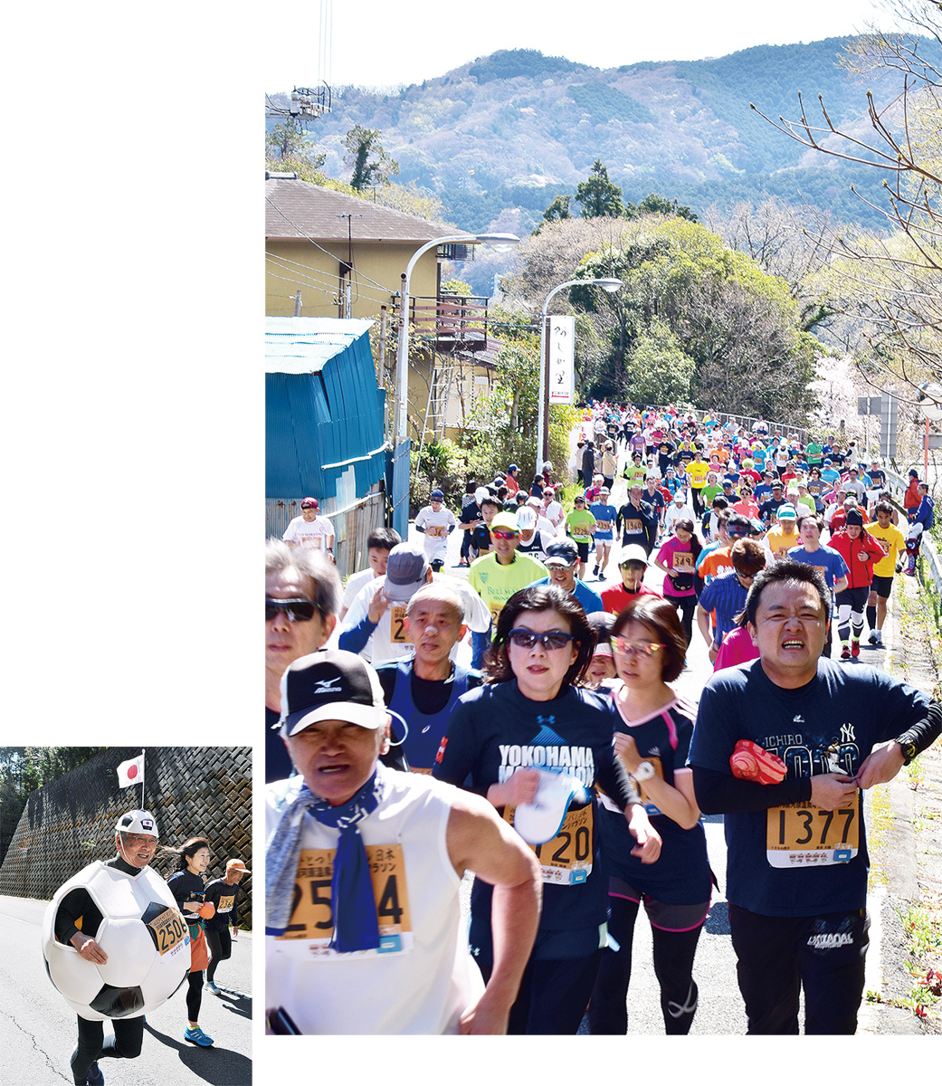 3月31日に開かれた湯河原のオレンジマラソン(10Km)で、1282人のランナーがオレンジラインを駆け上った。延々と続く坂道では住民が「もう少し」「がんばれ」など手を叩きながら応援。大勢の足音とともに「苦しい」「あー」などの呻きが聞こえた。1位は32分28秒でゴールした小田原市役所の地域政策課職員・樽木将吾さん(28)で、これで4連覇。福岡国際で39位に入る実力派で「今回は風がきつかった。オレンジマラソンは10連覇したい」と語った。