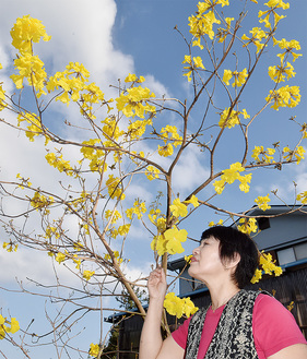 湯河原町吉浜の(株)ヤマセイの前で4月25日に黄色い「イッペー」(イペー)が満開となった。同社の山田昭夫さん(75)が5年前に妻の実家がある宮崎県で購入した苗を、飛行機で持ち帰ったもの。花に鼻を近づけると、まさにソフトクリームの香り。九州では特段珍しい花ではないが、山田さんによると「開花を待っている人が多く、問合せが来る。今年の開花は例年より遅い」と話していた。