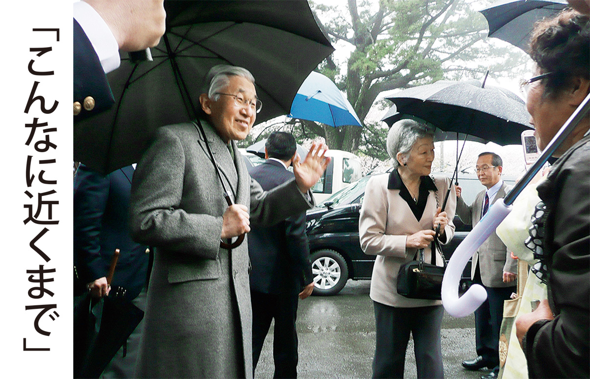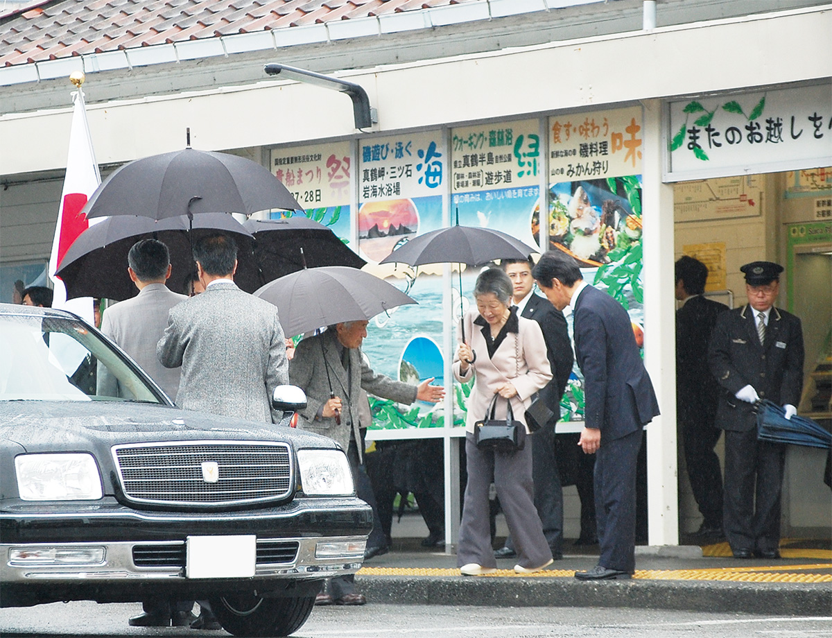 4月の真鶴訪問は、ご静養で須崎御用邸へ向かう途中だった。行政サイドも事前広報を控えなければならない事情があったが、真鶴駅前には歓迎の人垣ができた。小雨のなかE655系と呼ばれる漆色の車両がホームに到着。改札とロータリーの間に小さな段差があり、天皇陛下(当時)は皇后陛下の手をとり、車に乗り換えた。お林は徒歩で雰囲気を味わうように散策され、クスやクロマツの樹齢などを尋ねられたという。偶然遊歩道で出会った観光客は仰天していた。ケープ真鶴ではゆっくりと町民の方へ歩かれ、傘も触れ合いそうな距離に。町民からは「信じられない」「すごい」といった声が続出した。当時町長だった青木健氏は両陛下に、お林がかつて御料林として守られた経緯や、本小松石が江戸城(皇居)の石垣に使われた歴史を説明した。