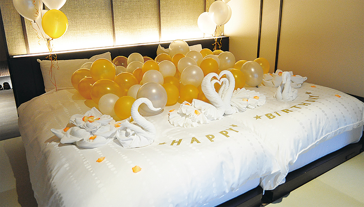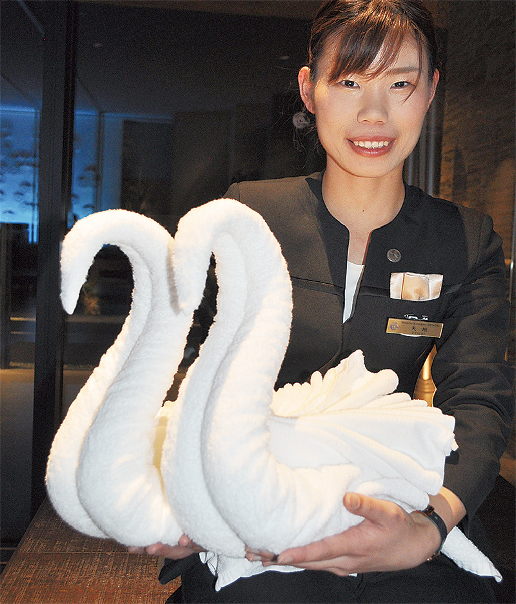 箱根町二ノ平「箱根小涌園天悠」にタオルのスワンなどで記念日を祝うオプションが登場した。「祝泊」と銘打った新事業で、天悠に4人いるコンシェルジュが飾り付けを担当。LEDキャンドルやバルーンなども駆使して利用客のリクエストに応える。昨年、天悠で記念日を過ごした利用件数は2千組を超え、プロポーズのセッティングもあった(結果はもちろん成功)。コンシェルジュの一人、矢地由布子さん(29)が抱く2羽のスワン=写真はタオルを堅く巻き上げてクチバシや胴体を作り、羽は別のタオルを折って載せてある。すべて独学で、花やウサギといったバリエーションも。「持って帰りたい」という声もあるという。