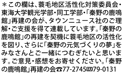 昨年は、手探りで、「秦野の鹿鳴館再建の会」や東海大学観光学部・工学部等のご支援とともに、皆様からの励ましで様々な事業を実施することができました。