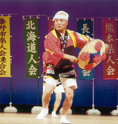 同会の落合信友会長は、「正調花笠音頭を、少しでもたくさんの人に知って欲しいと会を結成した」と話す。今月6日に文化会館で開催された第3回秦野市県人会のつどいで、10人の仲間とともに、流派の1つ寺内流の花笠音頭を披露した。