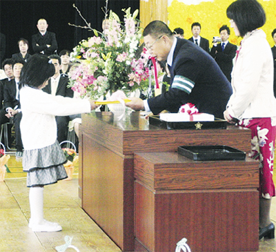 秦野市交通安全協会が4月5日、市内13の小学校で新入学児童1430人に、黄色のランドセルカバーと交通安全教育冊子、交通安全あいうえお表を贈呈した。