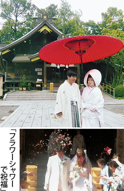 もちろんウエディングドレスによる挙式も可能。フラワーシャワーなどオリジナル演出も歓迎。境内の一般のお客様からお祝いの言葉がかかるサプライズも。