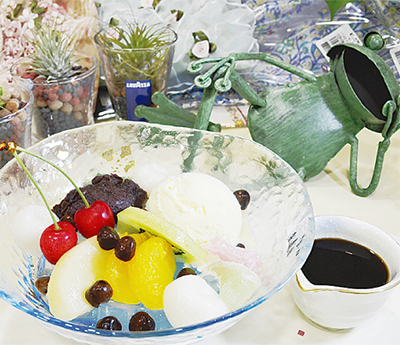 この夏イチオシのメニューは、「白玉クリームあんみつ(650円)」。オーナーこだわりの口どけの良い寒天と特製黒蜜は、「他にはない美味しさ」とリピーターも多いそう。「暑い夏に少しでも涼しさを」と話す。ほかにも自家製ピザやパスタ、カレーなど軽食もある。